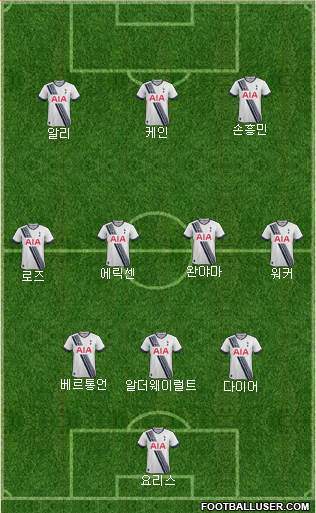 요리스 · 다이어 · 알더웨이럴트 · 베르통언 · 로즈 · 에릭센 · 워커 · 완야마 · 알리 · 케인 · 손흥민