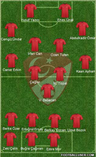 Yusuf Yazıcı · Enes Ünal · Abdulkadir Ömür · Cengiz Ünder · İrfan Can · Ozan Tufan · Caner Erkin · Kaan Ayhan · Çağlar · M. Topal · V. Babacan · Berke Özer · Ertuğrul Ersoy · Berkay Özcan · Umut Bozok · Zeki Çelik · Buğra Çağıran · Emre MorTürkiye Olimpiyat Futbol Kadrosu