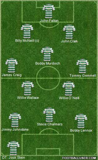 DT: Jock Stein · Bobby Lennox · Jimmy Johnstone · Stevie Chalmers · Willie O¨Neill · Willie Wallace · Tommy Gemmell · James Craig · Bobby Murdoch · John Clark · Billy McNeill (c) · John FallonRodar el balon , era el lema, pero recibian patadas atemorizantes....