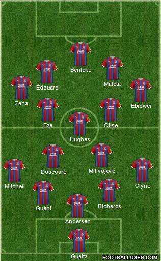 Guaita · Andersen · Guéhi · Richards · Mitchell · Clyne · Doucouré · Milivojević · Hughes · Eze · Olise · Ebiowei · Zaha · Édouard · Mateta · BentekeBest players all on the pitch.