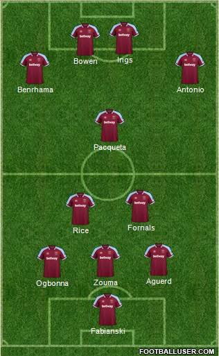 Fabianski · Ogbonna · Zouma · Aguerd · Rice · Fornals · Pacqueta · Benrhama · Antonio · Bowen · IngsAntonio and Benrhama providing the crosses for Ings & Bowen. Rice protecting the back three