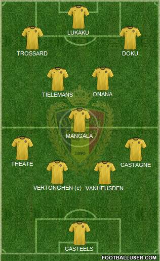 CASTEELS · VANHEUSDEN · VERTONGHEN (c) · CASTAGNE · THEATE · MANGALA · TIELEMANS · ONANA · TROSSARD · DOKU · LUKAKUSubs: