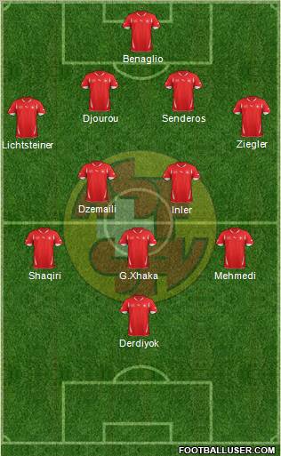 Benaglio · Djourou · Senderos · Ziegler · Lichtsteiner · Dzemaili · Inler · Shaqiri · G.Xhaka · Mehmedi · DerdiyokSuiza 3-1 Bulgaria.