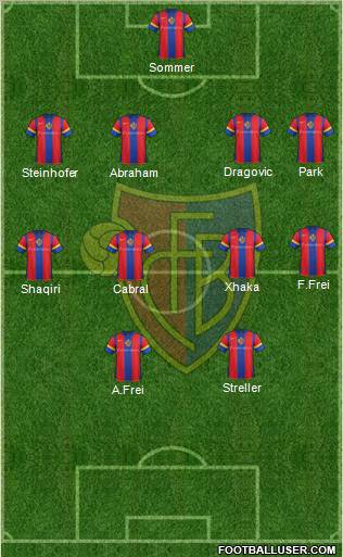 Sommer · Dragovic · Park · Steinhofer · Abraham · F.Frei · Xhaka · Shaqiri · Cabral · Streller · A.FreiBasel's line-up the night they defeated Manchester United 2-1, condemning United to the Europa League. Heiko Vogel, Basel's caretaker manager, fielded his side in a narrow 4-4-2ish shape, although the elements of 4-3-1-2 were there. Xherdan Shaqiri, who scored Basel's winning goal, was positionally based as a wide right player but he roamed freely across the spaces between the lines.