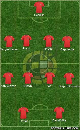 Torres · David Villa · Sergio Busquets · Xabi Alonso · Iniesta · Xavi · Capdevilla · Sergio Ramos · Pique · Puyol · CasillasI chose this formation because it is Spain's real formation.