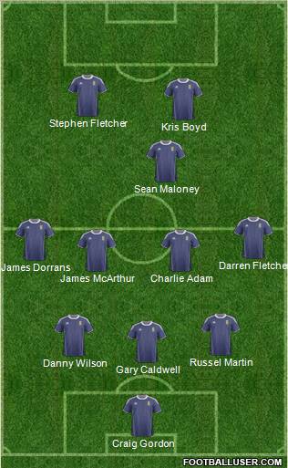 Craig Gordon · Gary Caldwell · Danny Wilson · Russel Martin · James McArthur · Charlie Adam · James Dorrans · Darren Fletcher · Sean Maloney · Kris Boyd · Stephen FletcherAttacking formation changing to 5-4-1 when defending.