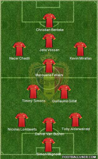 Simon Mignolet · Daniel Van Buyten · Nicolas Lombaerts · Toby Alderweireld · Guillaume Gillet · Timmy Simons · Marouane Fellaini · Nacer Chadli · Kevin Mirallas · Jelle Vossen · Christian BentekeRode Duivels beta