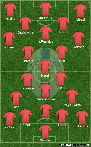 Casillas · a.Cole · d.Alves · Puyol · Lucio · Pique · Lass · Yaya Toure · Xabi Alonso · Fabregas · Xavi · Nasri · Iniesta · Ozil · Ribery · Robben · c.Ronaldo · David Villa · Pazzini · Messi · Anelka · Ibrahimovicasd