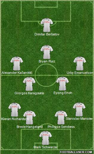 Mark Schwarzer · Brede Hangeland · Philippe Senderos · Kieran Richardson · Stanislav Manolev · Giorgos Karagounis · Eyong Enoh · Alexander Kačaniklić · Urby Emanuelson · Bryan Ruiz · Dimitar BerbatovEverton 1 : 0 Fulham