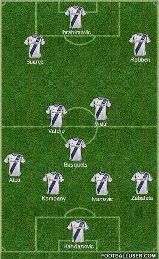 Handanovic · Ivanovic · Kompany · Zabaleta · Alba · Busquets · Valero · Vidal · Suarez · Robben · IbrahimovicSamir Handanovic - Quality goalkeeper. The big Slovenian is a major reason the Nerazzurri didn't finish in the bottom half of the table this year. Not a bad penalty-stopper either. World Class.