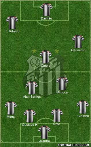 Aranha · Gustavo H. · Neto · Mena · Cicinho · Alan Santos · Arouca · Cícero · Geuvânio · T. Ribeiro · Damiãoé uma formação ofensiva, de acordo com o padrão do meu time, mas também tem boa marcação
