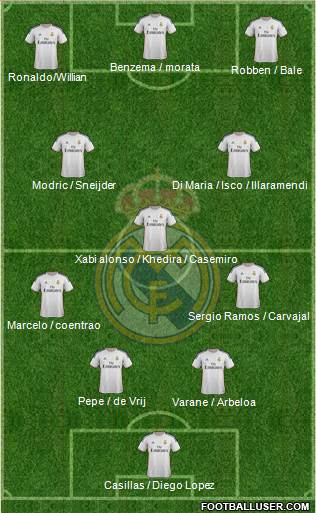 Casillas / Diego Lopez · Varane / Arbeloa · Pepe / de Vrij · Marcelo / coentrao · Sergio Ramos / Carvajal · Xabi alonso / Khedira / Casemiro · Modric / Sneijder · Di Maria / Isco / Illaramendi · Ronaldo/Willian · Robben / Bale · Benzema / morata