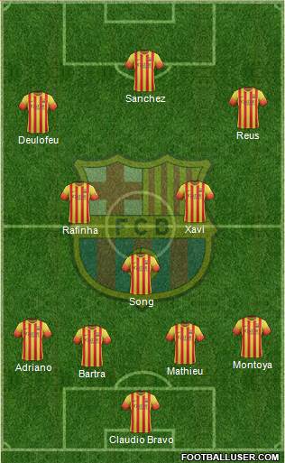 Claudio Bravo · Bartra · Mathieu · Adriano · Montoya · Song · Rafinha · Xavi · Deulofeu · Reus · Sanchez