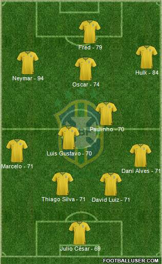 Julio César - 69 · David Luiz - 71 · Thiago Silva - 71 · Dani Alves - 71 · Marcelo - 71 · Luis Gustavo - 70 · Paulinho - 70 · Oscar - 74 · Neymar - 94 · Hulk - 84 · Fred - 79