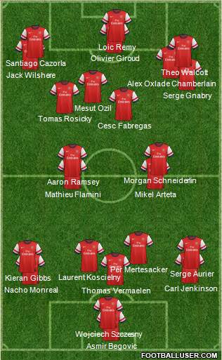Asmir Begovic · Wojciech Szczesny · Thomas Vermaelen · Nacho Monreal · Carl Jenkinson · Kieran Gibbs · Laurent Koscielny · Serge Aurier · Per Mertesacker · Mathieu Flamini · Mikel Arteta · Aaron Ramsey · Morgan Schneiderlin · Cesc Fabregas · Tomas Rosicky · Mesut Ozil · Serge Gnabry · Alex Oxlade Chamberlain · Jack Wilshere · Theo Walcott · Santiago Cazorla · Olivier Giroud · Loic Remy
