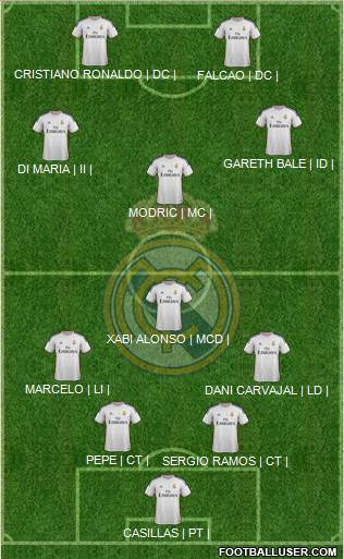 CASILLAS | PT | · SERGIO RAMOS | CT | · PEPE | CT | · DANI CARVAJAL | LD | · MARCELO | LI | · XABI ALONSO | MCD | · MODRIC | MC | · DI MARIA | II | · GARETH BALE | ID | · FALCAO | DC | · CRISTIANO RONALDO | DC |