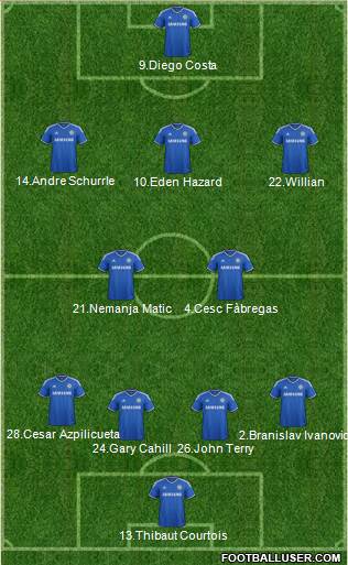 1.Petr Cech 6.Filipe Luís 33.Tomas Kalas12.John Obi Mikel 7.Ramires14.Andre Schurrle 19.Demba Ba