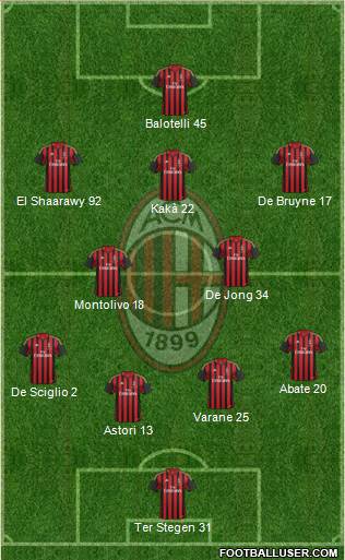 Ter Stegen 31 · Astori 13 · Varane 25 · De Sciglio 2 · Abate 20 · Montolivo 18 · De Jong 34 · Kakà 22 · El Shaarawy 92 · De Bruyne 17 · Balotelli 45