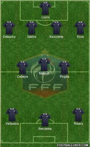 Lloris · Debuchy · Sakho · Koscienly · Evra · Matuidi · Cabaye · Pogba · Valbuena · Ribery · Benzema