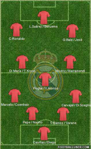Casillas / Diego · S.Ramos / Varane · Pepe / Nacho · Carvajal / Di Sceglio · Marcelo / Coentrao · Pogba / X.Alonso · Di María / T.Kroos · Modric / Illarramendi · G.Bale / Jesé · C.Ronaldo · L.Suárez / Benzema