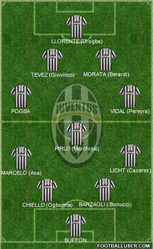 BUFFON · CHIELLO (Ogbonna) · BARZAGLI ( Bonucci) · MARCELO (Asa) · LICHT (Caceres) · PIRLO (Marchisio) · POGBA · VIDAL (Pereyra) · TEVEZ (Giovinco) · MORATA (Berardi) · LLORENTE (Drogba)