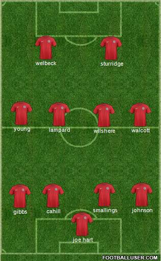 joe hart · gibbs · cahill · smallings · johnson · wilshere · walcott · lampard · young · sturridge · welbeck