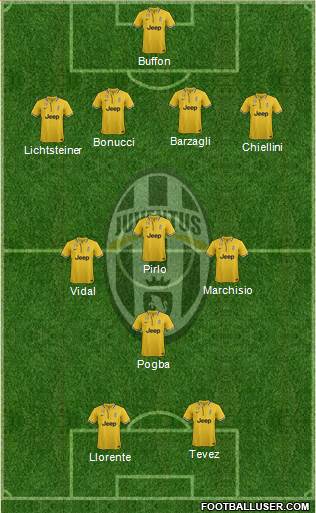 Llorente · Tevez · Pogba · Vidal · Marchisio · Pirlo · Lichtsteiner · Chiellini · Bonucci · Barzagli · BuffonI believe this formation could be the initial formation chosen for the upcoming 14/15 season by new head coach Massimiliano Allegri.