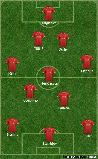 Sturridge · Ibe · Sterling · Lallana · Coutinho · Henderson · Kelly · Enrique · Skrtel · Agger · Mignolet