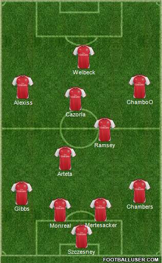 Szczesney · Monreal · Mertesacker · Gibbs · Chambers · Arteta · Ramsey · Cazorla · Alexiss · ChamboO · Welbeck