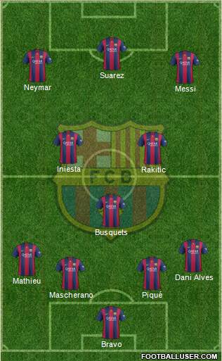 Bravo · Mascherano · Piqué · Mathieu · Dani Alves · Busquets · Rakitic · Iniesta · Messi · Neymar · Suarez