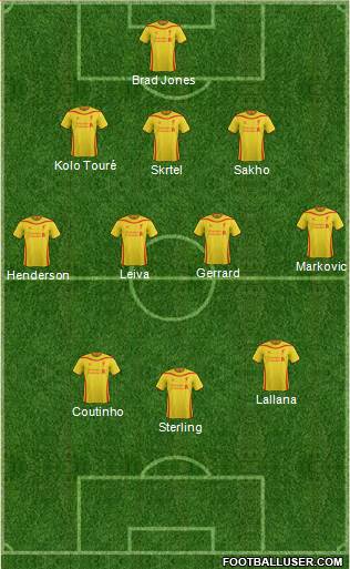 Brad Jones · Kolo Touré · Skrtel · Sakho · Markovic · Gerrard · Leiva · Henderson · Lallana · Coutinho · Sterling