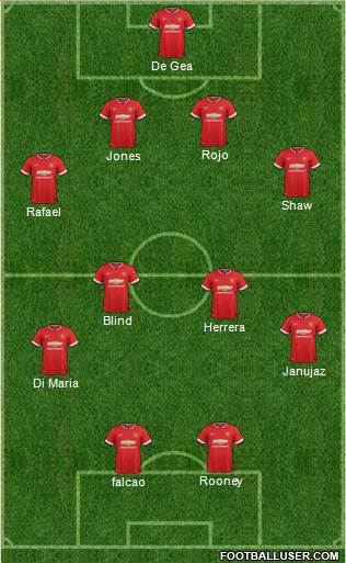 falcao · Rooney · Di Maria · Janujaz · Herrera · Blind · Rafael · Shaw · Jones · Rojo · De Gea