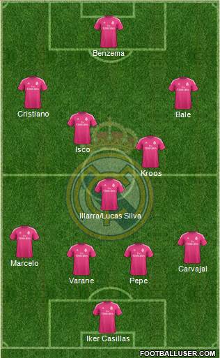 Iker Casillas · Varane · Pepe · Carvajal · Marcelo · Illarra/Lucas Silva · Kroos · Isco · Bale · Cristiano · Benzema