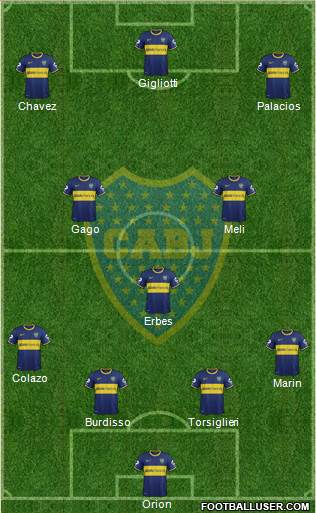 Orion · Burdisso · Torsiglieri · Marin · Colazo · Erbes · Gago · Meli · Chavez · Palacios · GigliottiLa formacion de Boca confirmada si no hay ningun inconveniente para el debut den la Copa Libertadores de América 2015 el Miércoles 18/02/15