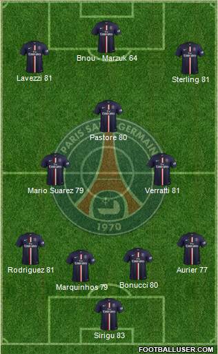 Sirigu 83 · Marquinhos 79 · Bonucci 80 · Rodriguez 81 · Aurier 77 · Mario Suarez 79 · Verratti 81 · Pastore 80 · Sterling 81 · Lavezzi 81 · Bnou - Marzuk 64