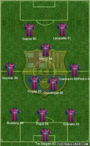 Ter Stegen 83 · Sokratis 83 · Pique 85 · Boateng 85 · Gundogan 83 · Pogba 83 · Cuadrado 88/Pedro 84 · Neymar 88 · Messi 94 · Suarez 90 · Lacazette 81