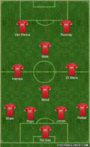 De Gea · Rojo · Jones · Shaw · Rafael · Blind · Herrera · Di Maria · Mata · Van Persie · Rooney