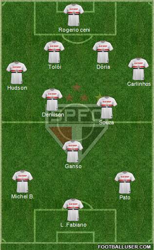 Rogerio ceni · Tolói · Dória · Carlinhos · Hudson · Denilson · Souza · Ganso · Michel B. · Pato · L .Fabianocom essa formação o time joga mais compcto e tem mais opções de furas defesas sólidas