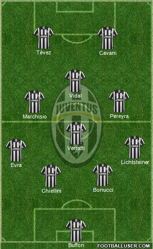 Buffon · Chiellini · Bonucci · Evra · Lichtsteiner · Verratti · Marchisio · Pereyra · Vidal · Cavani · Tévez