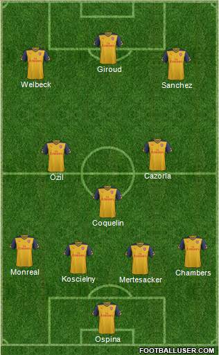 Ospina · Mertesacker · Koscielny · Chambers · Monreal · Coquelin · Özil · Cazorla · Sanchez · Welbeck · Giroud