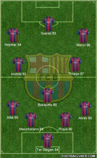 Ter Stegen 84 · Mascherano 84 · Pique 90 · Alves 85 · Alba 85 · Busquets 90 · Iniesta 92 · Thiago 87 · Messi 96 · Neymar 94 · Suarez 93