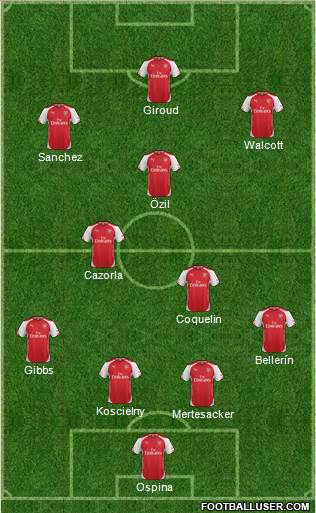 Ospina · Mertesacker · Koscielny · Gibbs · Bellerín · Coquelin · Cazorla · Özil · Sanchez · Walcott · Giroud