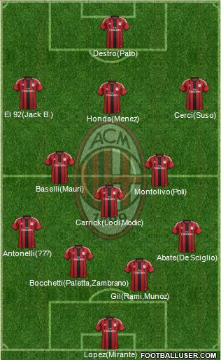 Lopez(Mirante) · Gil(Rami · Munoz) · Bocchetti(Paletta · Zambrano) · Abate(De Sciglio) · Antonelli(???) · Carrick(Lodi · Modic) · Montolivo(Poli) · Baselli(Mauri) · Honda(Menez) · Cerci(Suso) · El 92(Jack B.) · Destro(Pato)