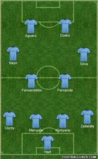 Hart · Mangala · Kompany · Clichy · Zabaleta · Fernandinho · Fernando · Silva · Nasri · Aguero · Dzeko