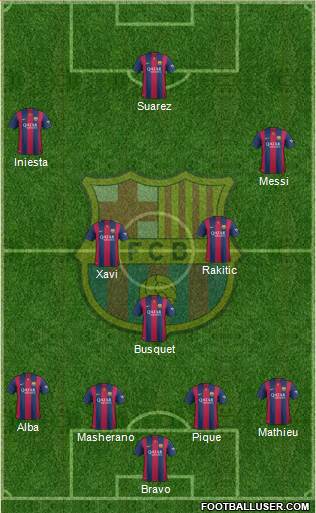 Bravo · Masherano · Pique · Mathieu · Alba · Busquet · Xavi · Rakitic · Messi · Iniesta · Suarez