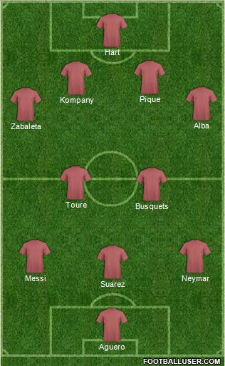 Aguero · Suarez · Messi · Neymar · Busquets · Toure · Zabaleta · Alba · Kompany · Pique · Hart