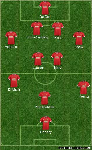 De Gea · Jones/Smalling · Rojo · Valencia · Shaw · Blind · Carrick · Di Maria · Young · Herrera/Mata · Rooney