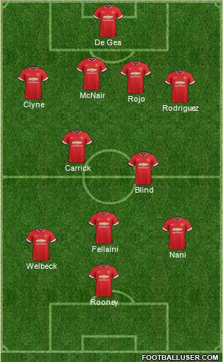 De Gea · McNair · Rojo · Clyne · Rodriguez · Carrick · Blind · Fellaini · Nani · Welbeck · Rooney