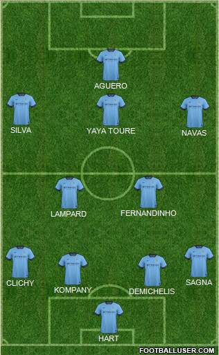 HART · DEMICHELIS · KOMPANY · CLICHY · SAGNA · LAMPARD · FERNANDINHO · NAVAS · YAYA TOURE · SILVA · AGUERO