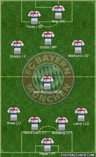 Neuer | PT · Boateng | CT · David Luiz | CT · Lahm | LD · Shaw | LI · Xabi Alonso | MCD · Shaqiri | II · Markovic | ID · Gotze | MP · Tevez | SD · Ibra | DC